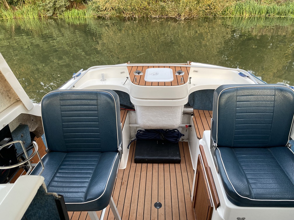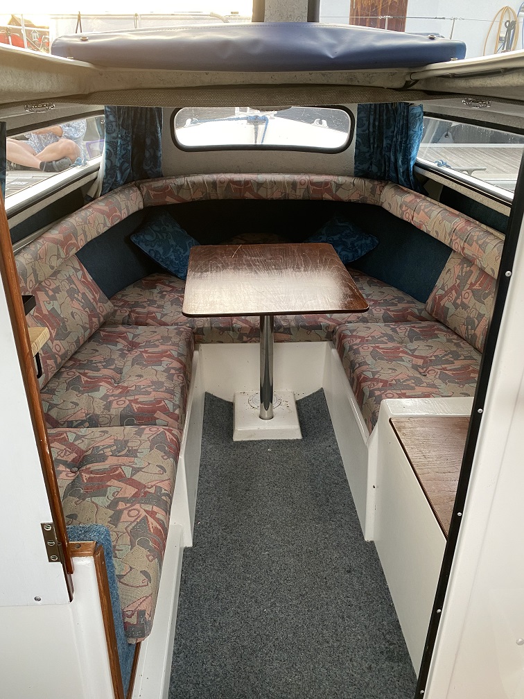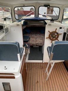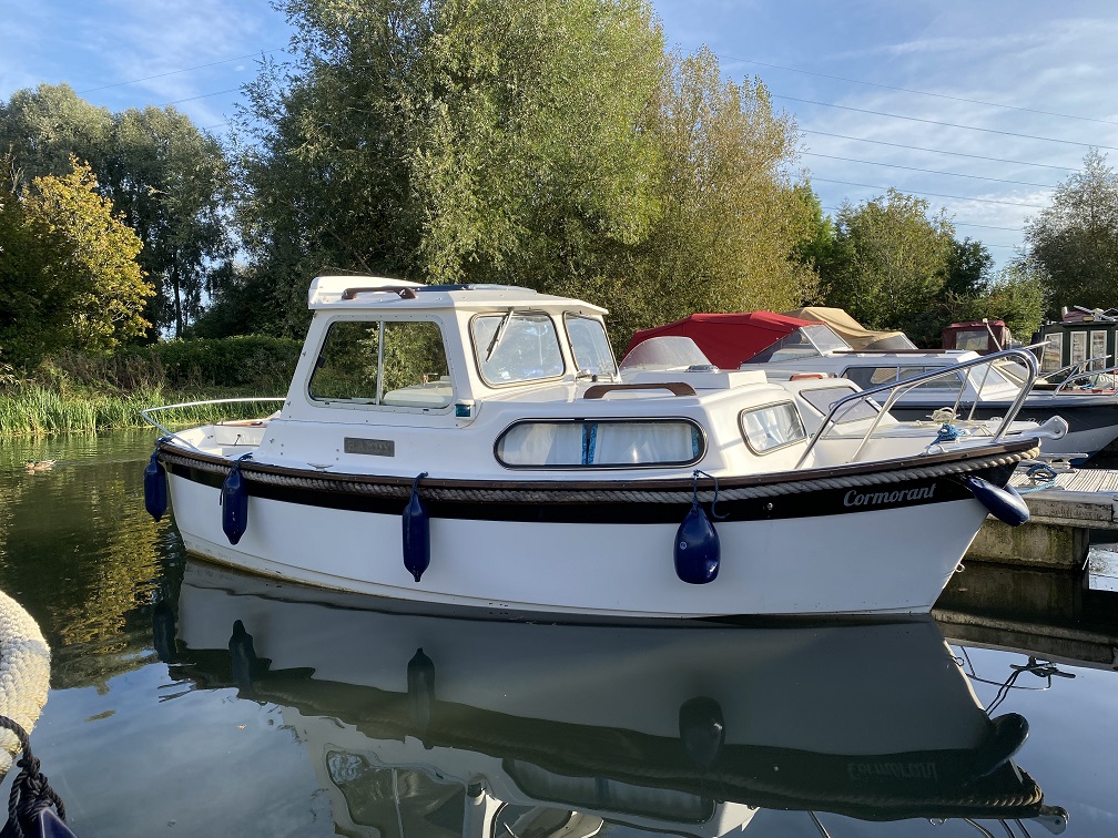 The cockpit and wheelhouse feel very spacious with its excellent head room, and comprises helm and navigator's seats, traditional ship's wheel, sunroof/hatch, sliding side windows, compass depth log switch panel, and plenty of storage in the underseat lockers. The two rear lockers house a battery on one side, and the fuel tank on the other. She also benefits from an engine cover, canopy, removable stainless steel light pole, self-draining anchor locker, anchor/chain/warp bow fairlead, a stainless steel pulpit rail, and comes complete with all the lines and fenders needed to cruise her. Her handrails are handmade in hard wood for durability, and the vessel is still in her original gel coat. Cormorant is powered by a Mercury Fourstroke Electric start engine that was upgraded to a 20hp by Mercury (Barrus) in 2012 thus making her an excellent boat for rivers, inland waters and coastal adventures.
