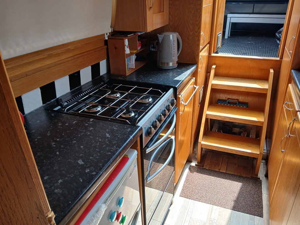Steps lead down from the deck into a well appointed and ergonomic galley with stainless steel sink and drainer to port, and a Shoreline fridge freezer and Spinflow/Thetford 4 burner hob, oven and grill to starboard. There is plenty of cupboard and drawer space for storage.