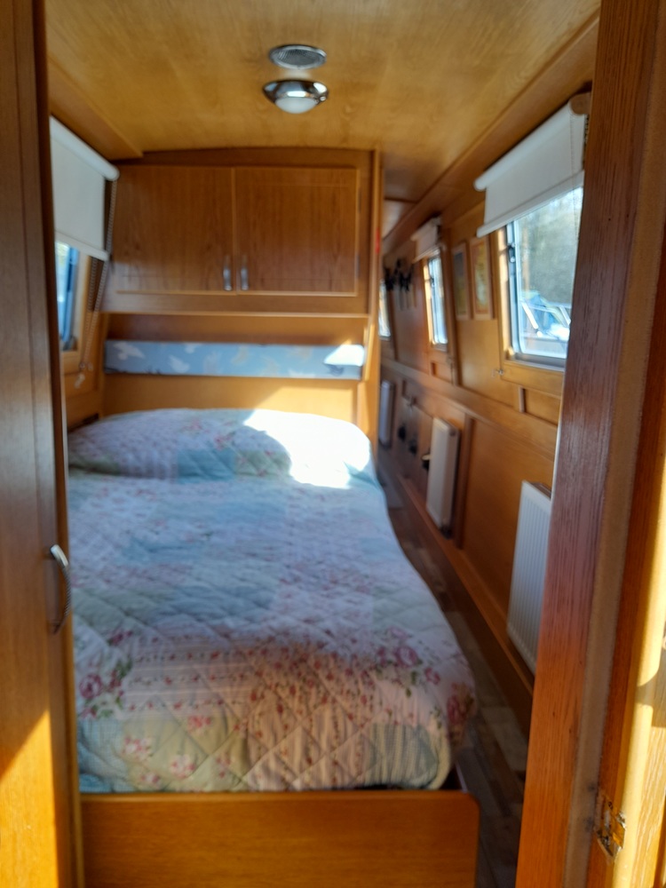 A door from the galley leads to the main cabin containing a full height cupboard, and a fixed double bed to port with cupboards above, and a radiator under the opposite gunwale.