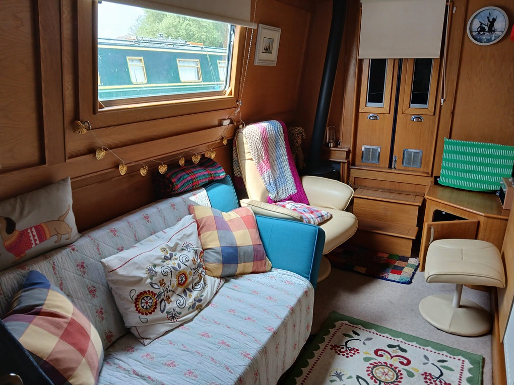 The saloon, at the bow, contains a Valor Willow wood burning stove, a sofa that converts into a double bed, recliner chair with footstool, TV to Moonraker antenna, corner unit for storage, and a small table that folds under the gunwale allowing dining for two, but saves space when not in use. Double doors lead out onto the bow where there is a bench seat with storage.