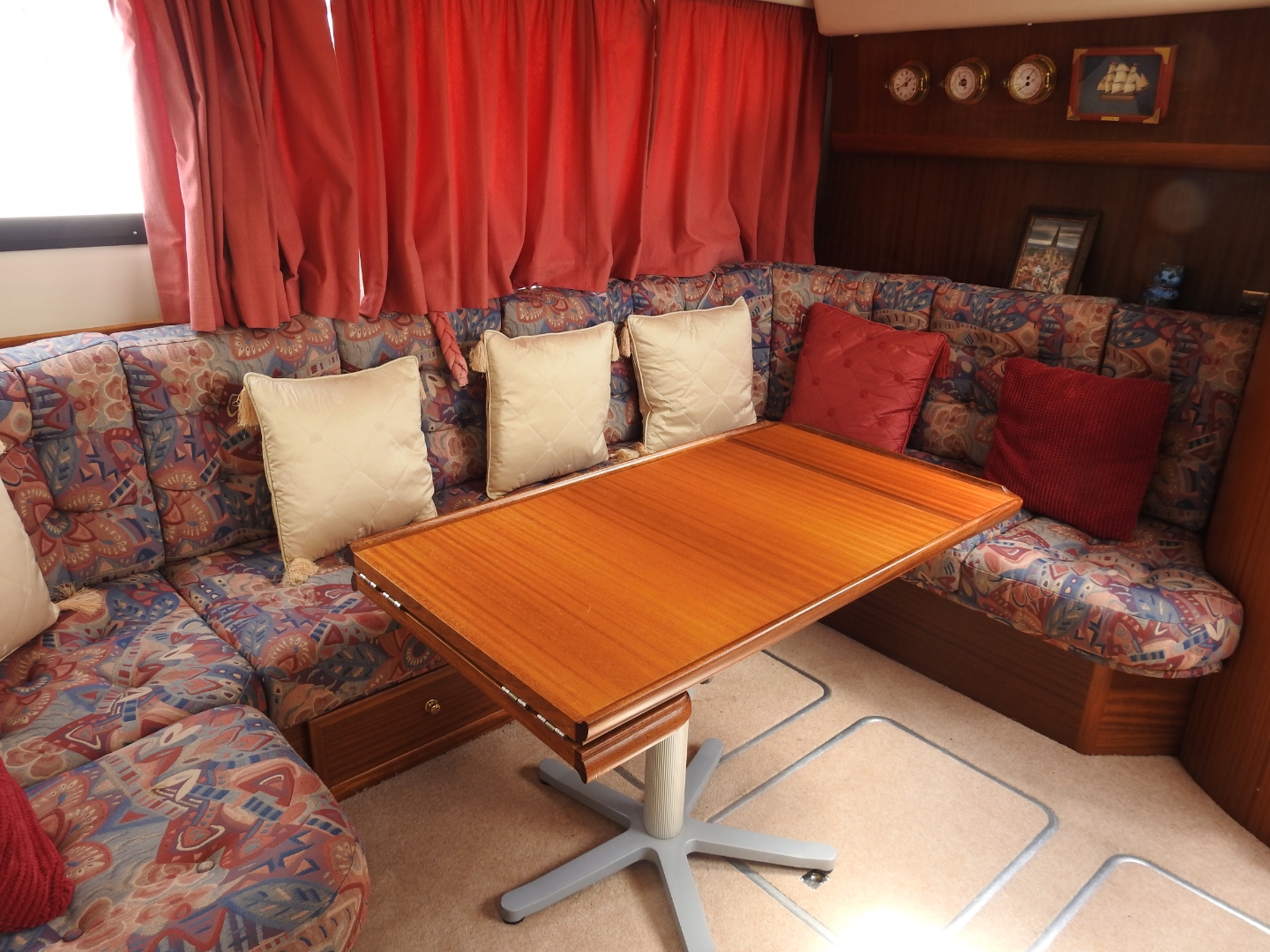 A door to port leads down a little stairwell into the main saloon. Here you will find a C-shaped seating area to starboard that can comfortably seat 6, with a table that is extended via folding leaves. There is also a separate cushioned seat/storage unit that can be used to convert the seating area into a double berth. Storage lockers can be found to port under large opening windows, and there is also the Eberspacher warm air heating control unit, a clock and barometer. Tidy hatches in the carpeted floor provide access to the engine bay for inspection and checks.