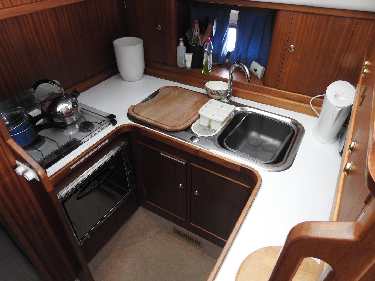 Leading down a few steps from the saloon to starboard is a neat and compact U-shaped galley with a double sink and drainer, 3 burner hob, oven and grill, 12v refrigerator, extractor fan, and plenty of cupboards and drawers for storage.